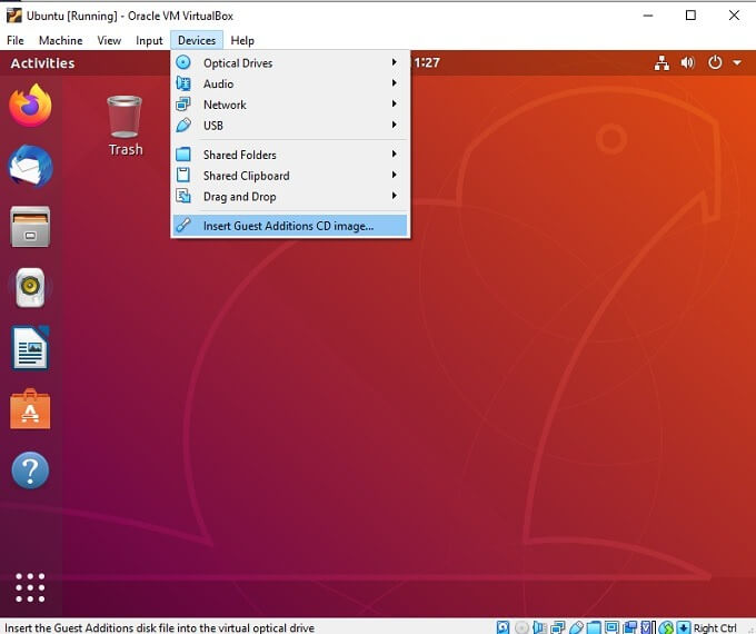 Before you can make shared folders work, you need to install *guest additions *on the virtual machine in question. This works by putting a virtual CD into the virtual machines imaginary CD drive. We’re using Ubuntu Linux here, but VirtualBox will automatically detect which additions are right for the Guest operating system.