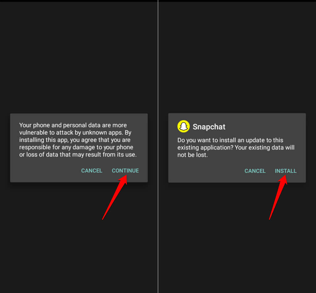 Open the Snapchat APK file, tap Continue, and select Install.