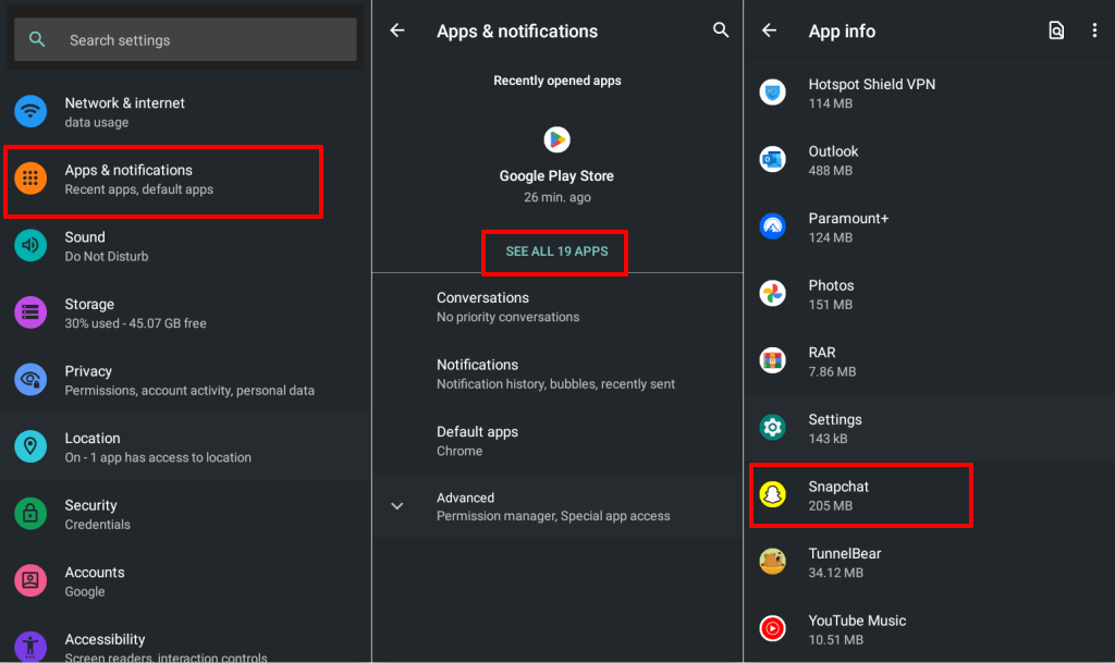 - Go to Settings > Apps & notifications > App info (See All Apps) and tap Snapchat.