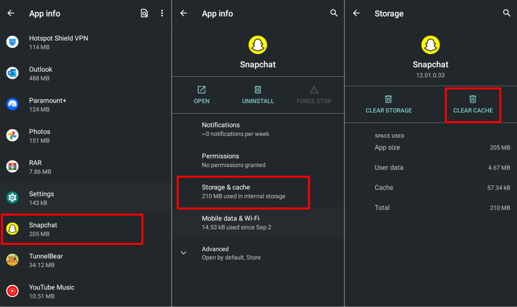 Deleting Snapchat’s cache files and storage data can get the app working again.