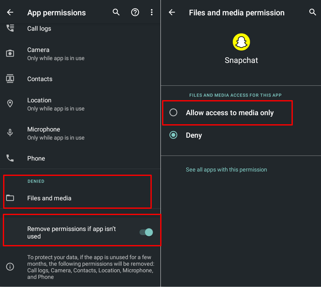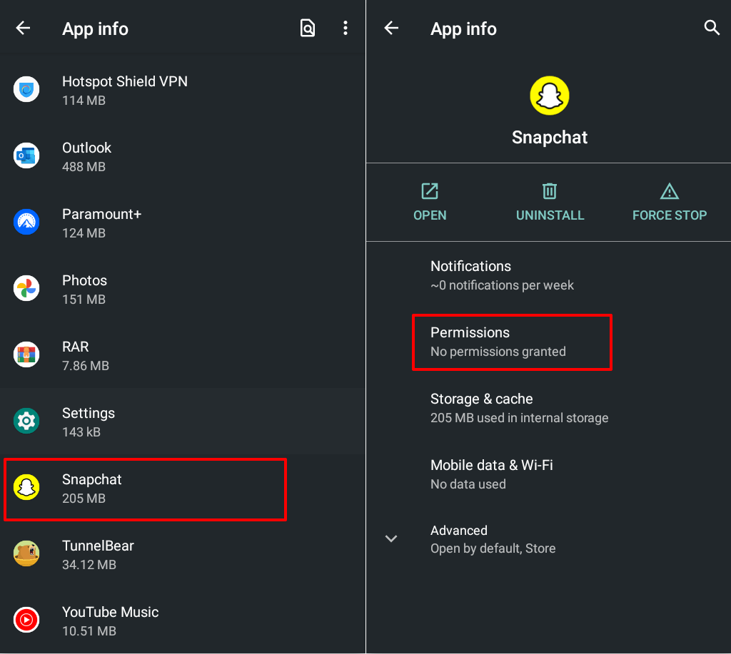 If you haven’t used Snapchat in a few months, Android will revoke the app’s permissions. Verify that Snapchat has access to essential system components it needs to work correctly. Force close Snapchat and follow the steps to adjust its permissions.