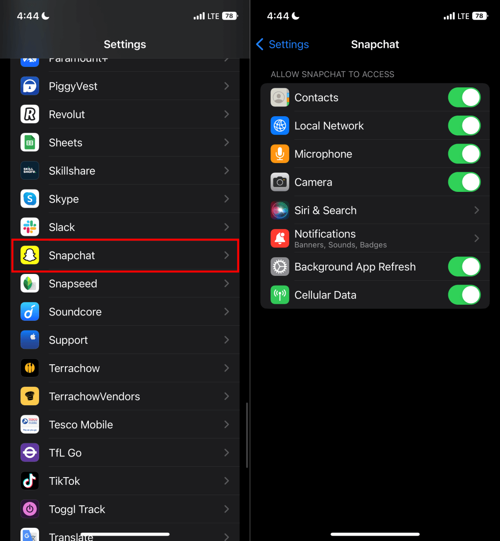 Go to Settings > Snapchat and grant Snapchat the necessary permissions—Contacts, Local Network, Microphone, Camera, and Cellular Data.