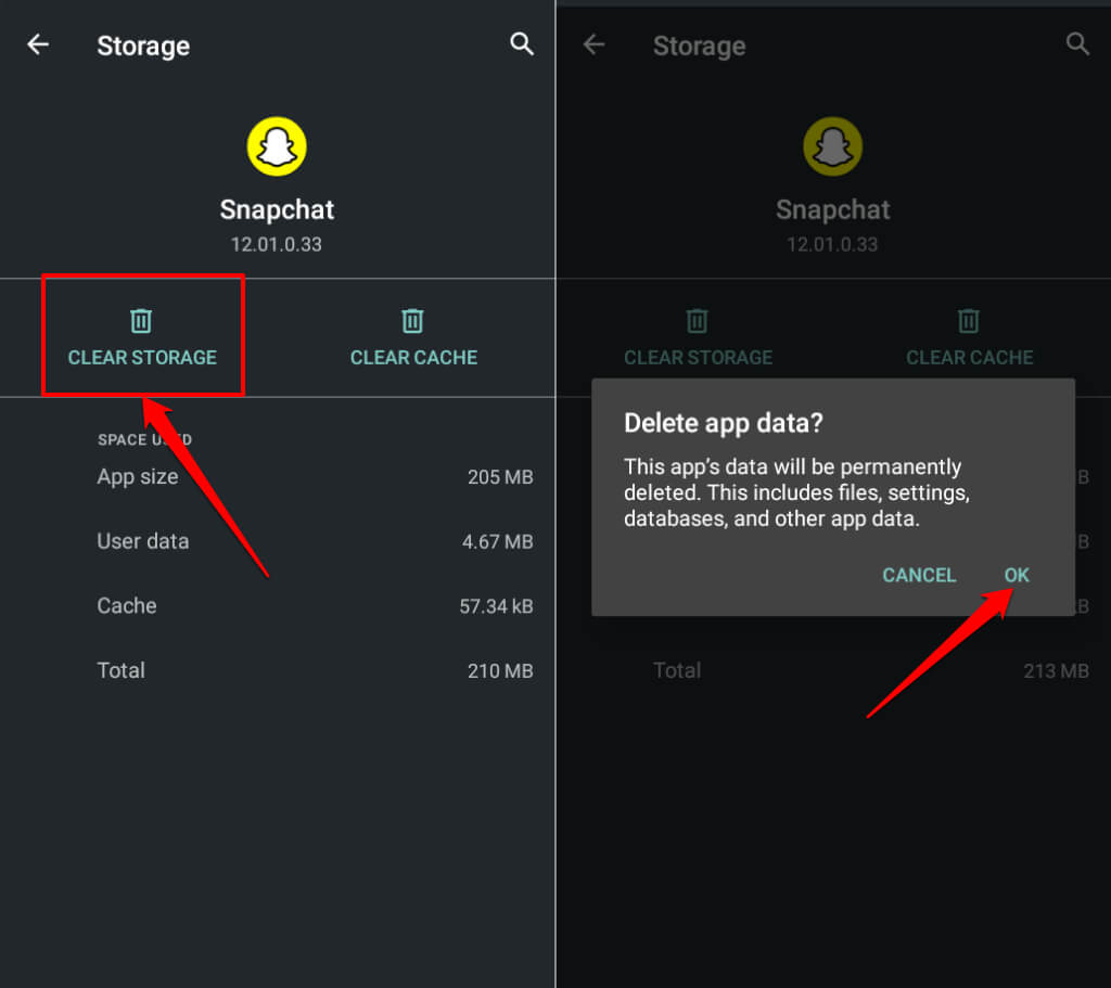 - Select Clear Cache and open Snapchat again. Delete Snapchat’s storage data if the problem persists.