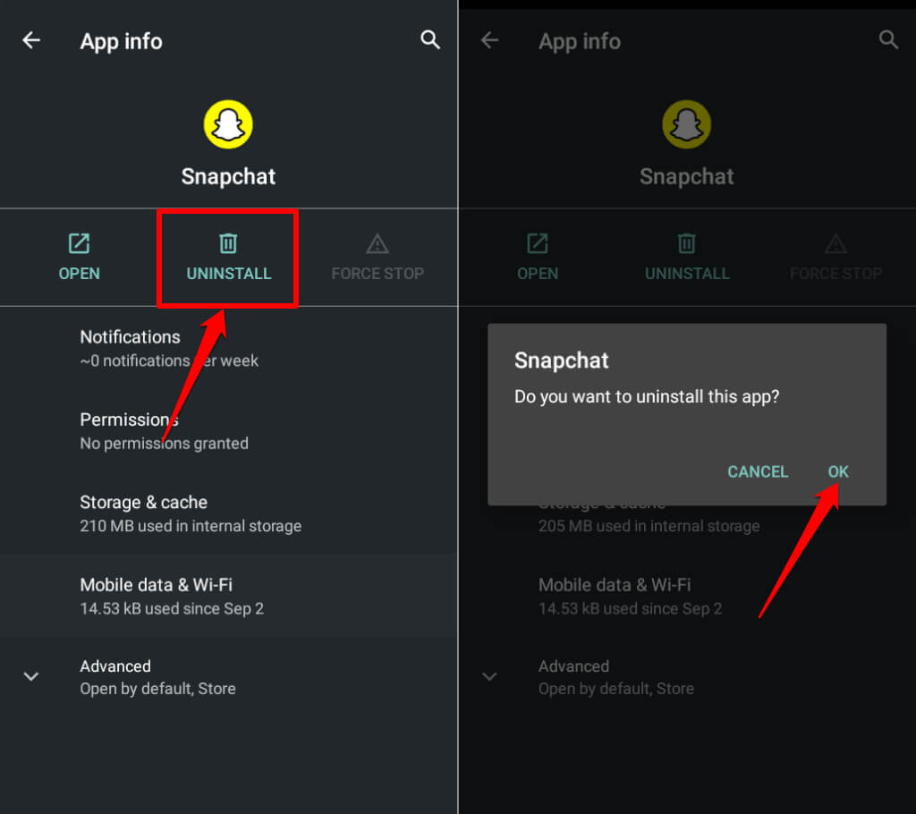 Go to Settings > Apps & notifications > Snapchat, tap Uninstall and select OK.