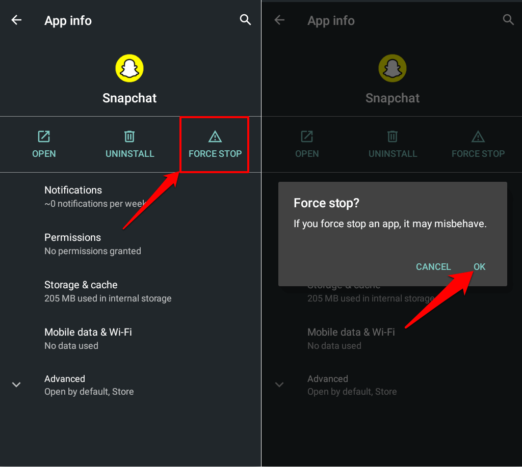 - Tap Force Stop and select OK on the confirmation. Reopen Snapchat and check if your phone works.