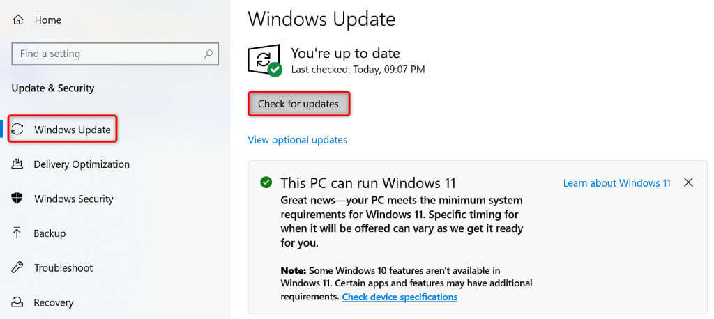 - Select Check for updates on the right pane.