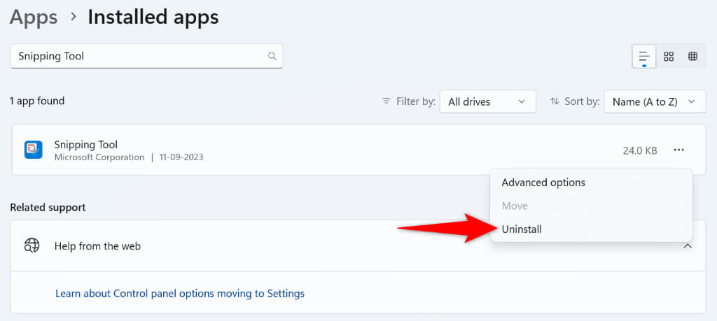- Find Snipping Tool, select the three dots next to the app, and choose Uninstall.