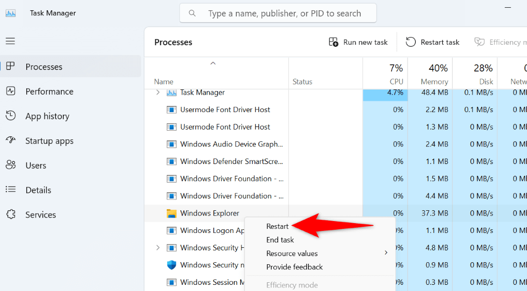 - Open the Processes tab, right-click Windows Explorer, and choose Restart.