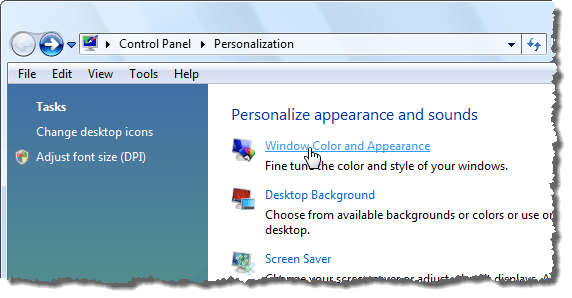 The Personalization screen on the Control Panel displays. Click the Window Color and Appearance link.