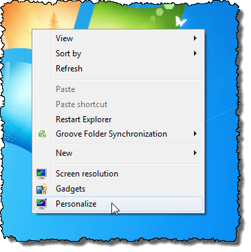 To disable the Aero Glass transparency in Windows 7, right-click on an empty area of the desktop and select Personalize from the popup menu.