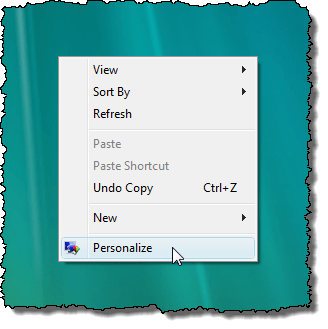 To disable the Aero Glass transparency in Windows Vista, right-click on an empty area of the desktop and select Personalize from the popup menu.