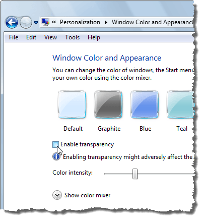 On the Window Color and Appearance screen, select the Enable transparency check box so there is NO check mark in the box.