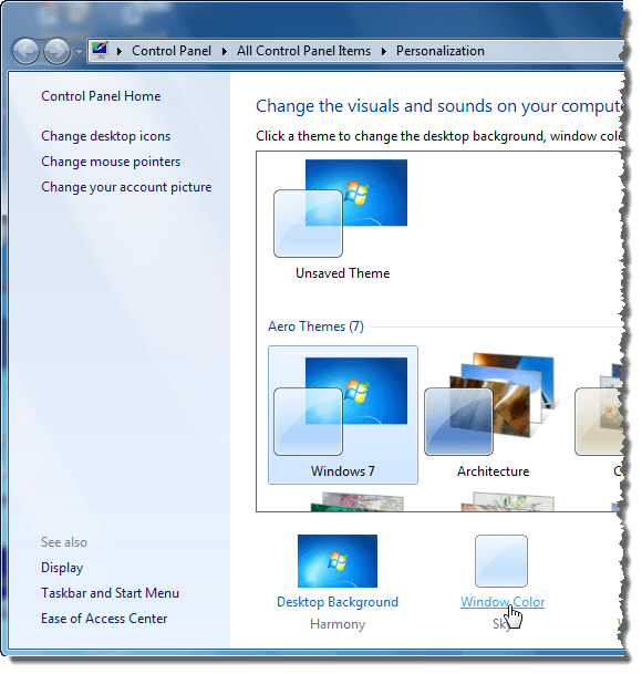 The Personalization screen on the Control Panel displays. Click the Window Color link below the themes.