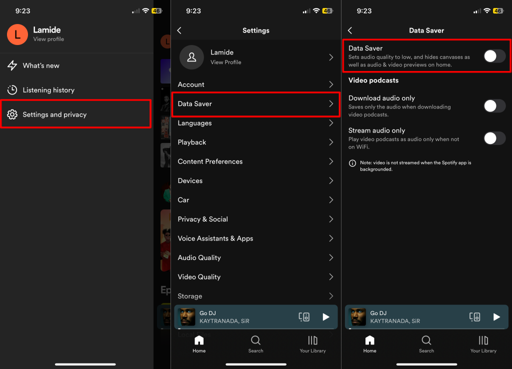 Tap your Spotify profile icon, select Settings and privacy > Data Saver, and toggle off Data Saver.