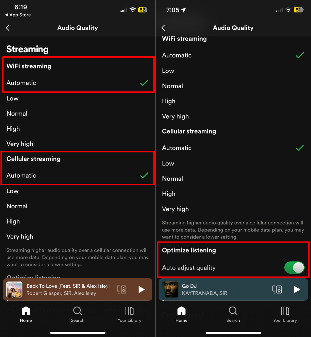 - Set the audio quality for “Wi-Fi Streaming” and “Cellular Streaming” to **Automatic**. Additionally, turn on **Auto adjust quality**.