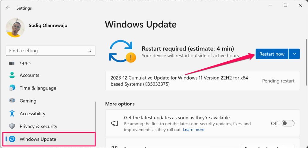 If you stream Spotify on a Windows PC, go to Settings > Windows Update and select Check for updates or Restart now.
