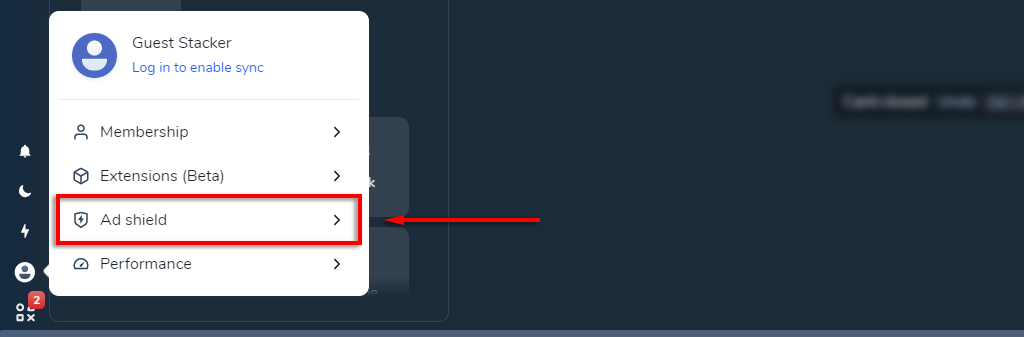 To enable Ad shield, click on your Profile icon at the bottom-left of the screen and select Ad shield.