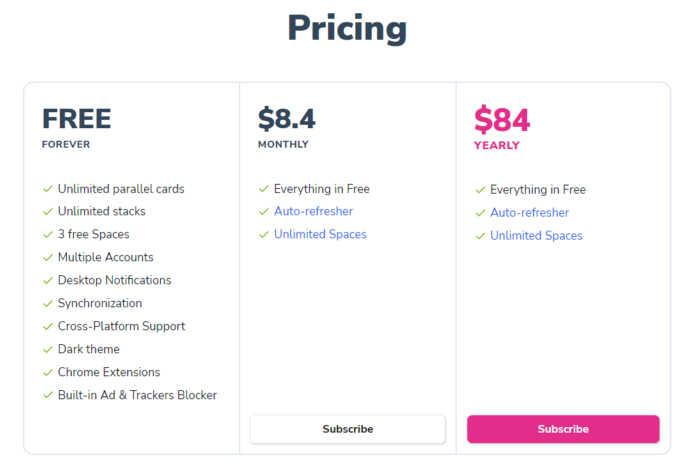 The PRO version adds an auto-refresher function and unlimited spaces. It costs either $8.40 per month or $84.00 per year.