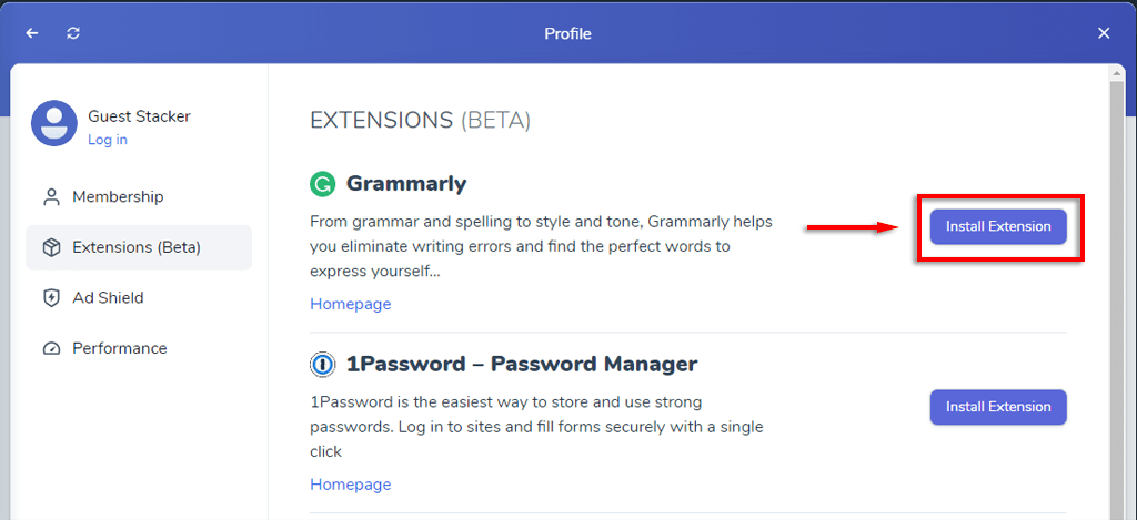 You’re able to use many popular browser extensions, including several Chrome productivity extensions, and Stack is aiming to add more as development continues. To enable these, click on your Profile then select Extensions. You can install extensions by clicking Install Extension.