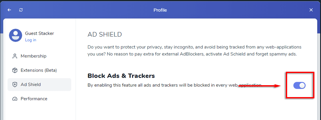 Stack offers an ad tracker and blocker called Ad shield. Unfortunately, very little information is given on this feature, so it’s uncertain how it compares to the best ad blockers for other browsers.