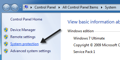 Right-click on Computer or This PC and choose Properties. Then click on the System Protection link.