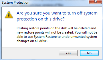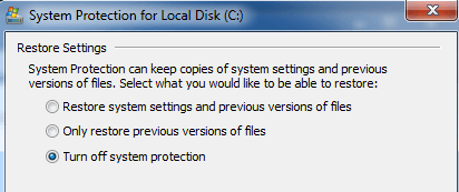 Now go ahead and click on the Turn off system protection radio button and click OK.