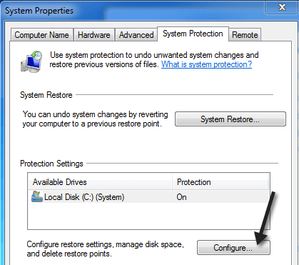 Then click on the Configure button on the System Protection tab. You should also see that it says On for the current drive.