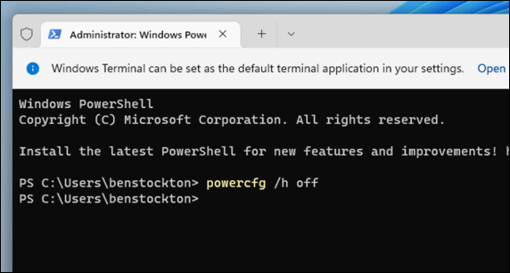 - In the Terminal window, type powercfg /h off and press Enter to disable Fast Startup.