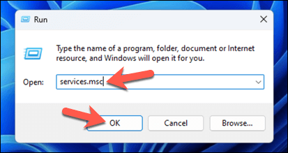 - In Run, type services.msc and press OK or hit the Enter key.