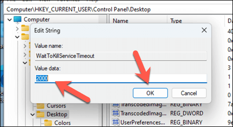 - Name the new string value as WaitToKillServiceTimeout. * Double-click on WaitToKillServiceTimeout and set its value. This value is in milliseconds, so entering 2000 will set the timeout to 2 seconds.