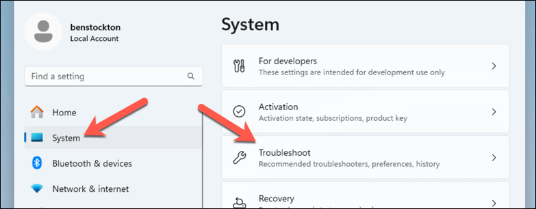 - In the Settings menu, press System on the left. * Choose Troubleshoot from the options on the right-hand side.