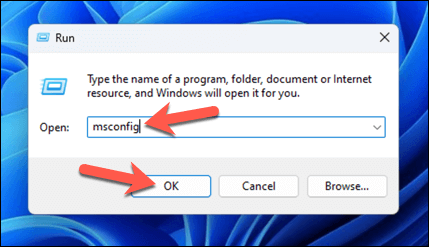 - Type msconfig into the Run box and press OK or Enter to open the System Configuration utility window.