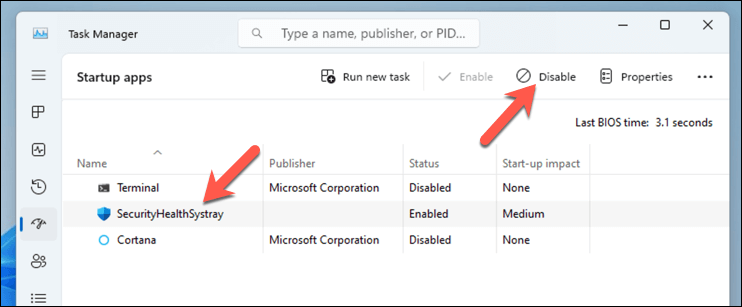 - In Task Manager, select each startup app you don’t need immediately upon login and click Disable.