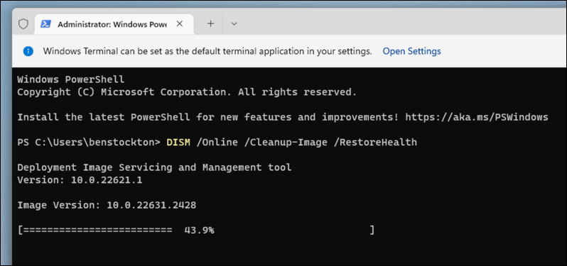 - In the Terminal window, type the command DISM /Online /Cleanup-Image /RestoreHealth and press Enter to start the DISM scan. This process may take some time to complete as it repairs your system image.