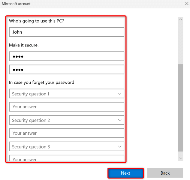 - Select I don’t have this person’s sign-in information in the window that opens. * Choose Add a user without a Microsoft account. * Enter the username, password, and security questions for your new account. Then, select Next.