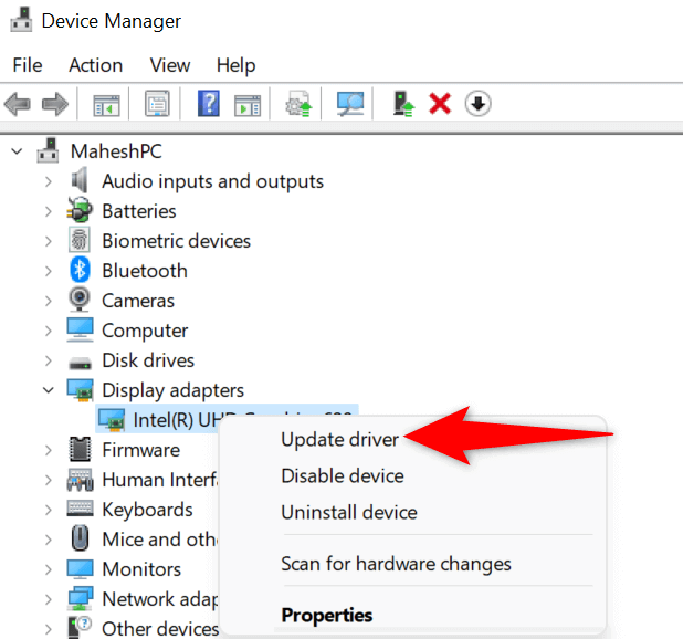 Your display adapter is responsible for drawing content on your screen. It’s possible this adapter’s drivers are corrupt or outdated, causing the taskbar to not draw your app icons. In this case, update your adapter drivers to the latest version, and your issue will be fixed.