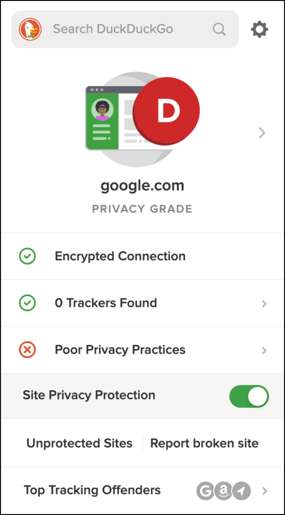 DuckDuckGo Privacy Essentials replaces Google with the extremely privacy-oriented DuckDuckGo as the default search engine. It also grades websites based on the number of trackers they use and their general privacy practices on a scale of A (safest) to F. It even comes with a Site Privacy Protection module that blocks trackers to bolster privacy.