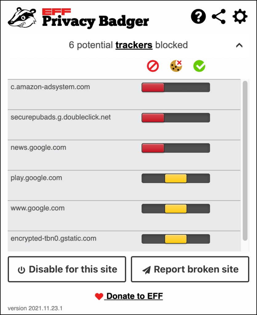 Privacy Badger is a Chrome extension from the EFF (Electronic Frontier Foundation) geared toward thwarting invisible tracking scripts and cookies. It sends websites the Global Privacy Control and Do Not Track signals and blocks trackers if they don’t comply. It also disables link prefetching (a mechanism that sites use to preload pages you’re likely to visit in advance), stops Google from monitoring web addresses you visit, and even replaces social media widgets with click-to-activate placeholders.