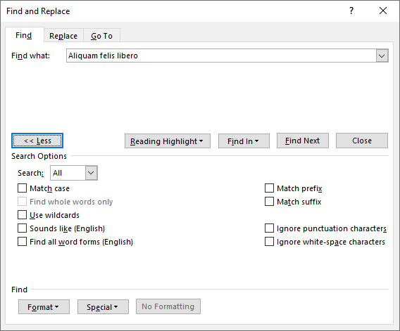- Ctrl + F: Find. Ctrl + G: Go to. Ctrl + H: Replace. These three keyboard shortcuts go together and are especially useful when you’re working with long documents. The Find keyboard shortcut might launch the Navigation pane instead of the dialog box shown below. The dialog box has multiple options the navigation pane lacks. You can always use the Ctrl + G or Ctrl + H keyboard shortcuts to launch the Find and Replace dialog box. Each function (find/replace/go to) is a separate tab in the box.