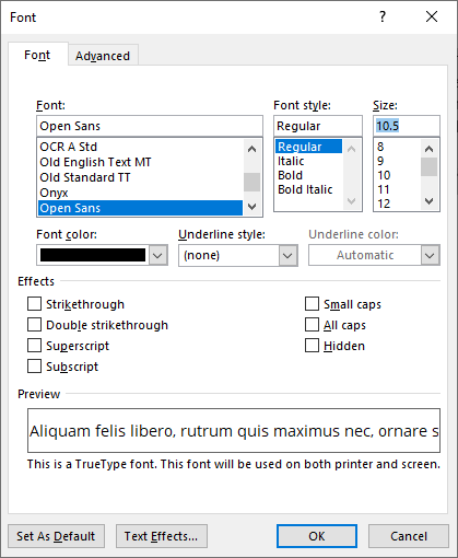 - Ctrl + D: Change character formatting. We use this to access effect options like Strikethrough, Double strikethrough, Superscript, and Subscript. It’s also useful for changing lowercase text to uppercase or small caps. You can also use it to change the font, font style, and size of the selected text.