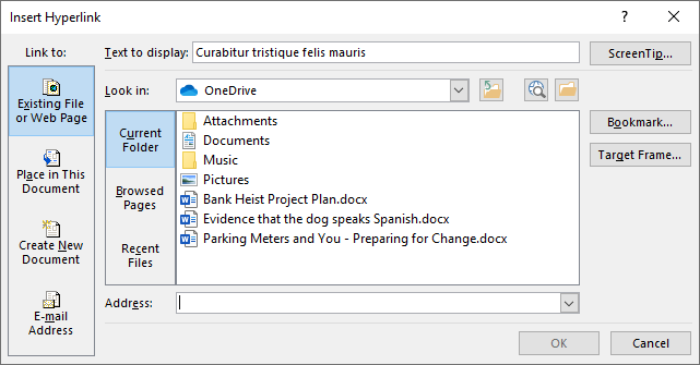 - Ctrl + K: Insert hyperlink. This one’s not just for links to web pages and email addresses. You can link to another place within the same document or another document entirely. You can even use it to create a new blank file and link to it, and Word will let you opt to edit the new document later or right away.