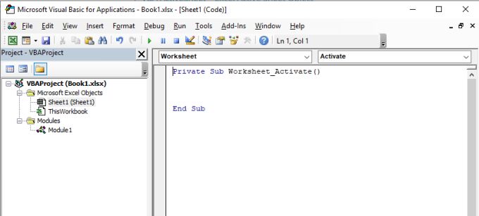 For example, in Excel, if you choose Worksheet and Activate, the code will run whenever the worksheet is opened.