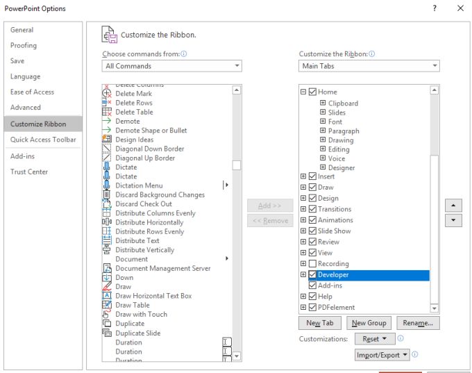 - If you don’t see Developer available on the right, then change the left Choose commands from dropdown to All Commands. Find Developer from the list and select Add» in the center to add that menu to the Ribbon.
