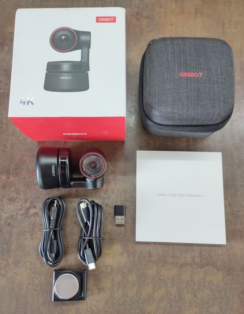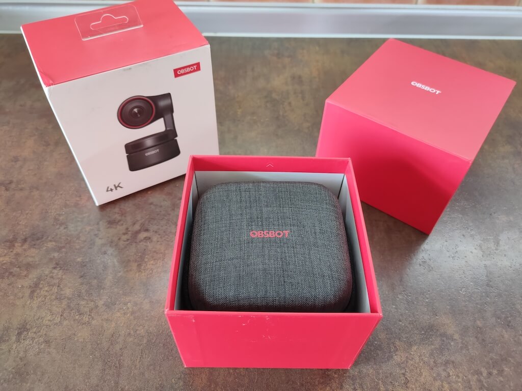 The first sign that the OBSBOT Tiny 4K is a higher-end webcam is the packaging. It comes in a stylish red and white box that in turn houses a hard carrying case. With premium packaging like that, you can be sure that your gear won’t be damaged when transported.