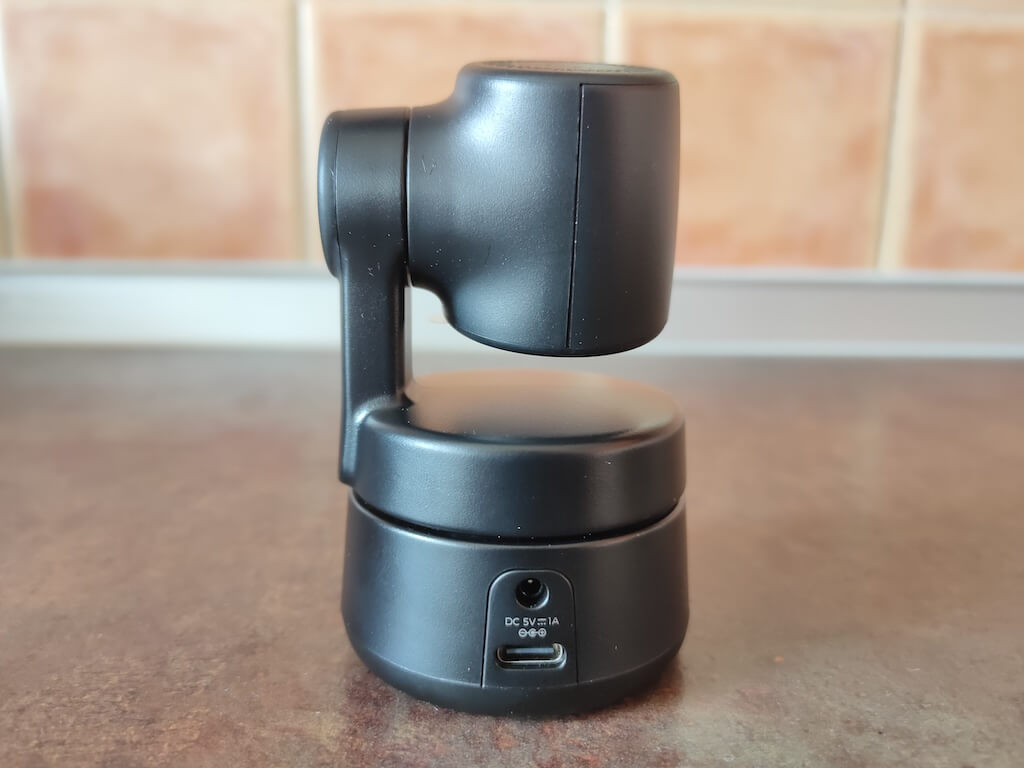 When you open the carrying case, you’ll find your Tiny 4K together with the charging cables and a mounting device. The case itself is a hard shell that can be used to store or carry the Tinky 4K with you. OBSBOT Tiny 4K is compact, light (5.18 ounces without mount) but durable. It has a matte black body with a round base. The base has a green light bar on the front that illuminates when the camera’s on. The top of the base rotates so the camera can pan left and right.