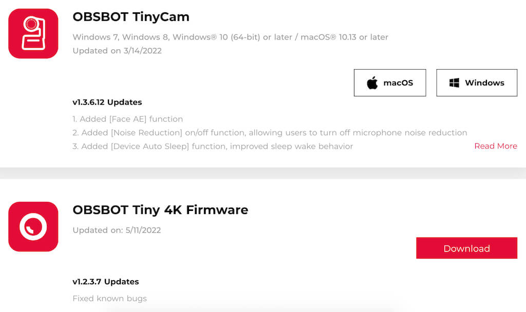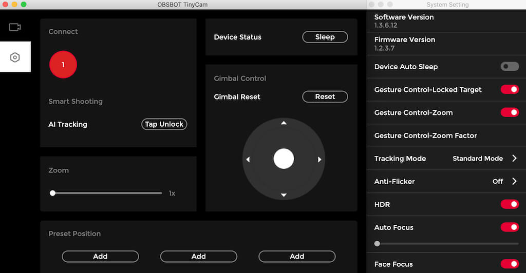 OBSBOt Tiny 4K has its own software and specific firmware that you can download from the company’s official site. The OBSBOT TinyCam app unlocks a number of features that otherwise you wouldn’t be able to use. TinyCam is compatible with Windows and Apple computers.