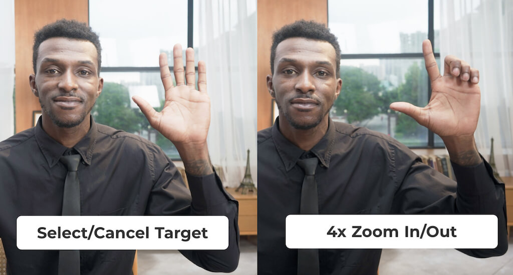 In addition to the AI tracking, you can use gestures to set a tracking target and zoom in and out. While Tiny 4K uses simple gestures as controls, getting them to work is still a bit of a learning curve. There are two gestures that you can use: a handwave for the camera to set your face as a target for tracking, and an L sign to zoom in and out.