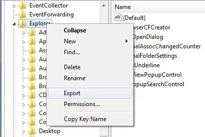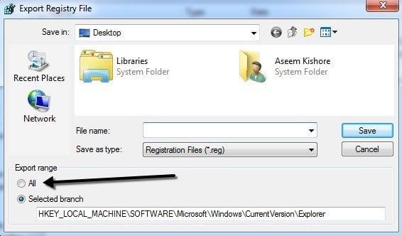 You’ll notice that there are quite a few other sub-keys under the main Explorer key. By default, only the selected branch along with sub-keys and values will get exported. If you want to export the entire registry, you have to choose All under Export Range when saving the .reg file.