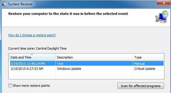 You will see the manually created restore points along with the automatically created ones too. You can check the** Show more restore points** box to see all the restore points stored on the system. If you click on the Scan for affected programs button, it will give you a list of any programs that were installed after the restore point was created since those will be removed. It will also tell you which programs were removed after the restore point was created that will be restored.