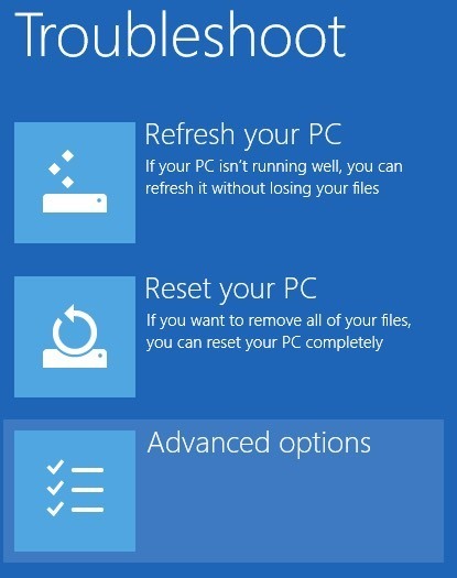 F8 no longer works when trying to get to this new interface. Luckily, I’ve already written a post about the different methods you can use to get to the advanced boot options screen in Windows 8. Once you have gotten to the main screen, click on Troubleshoot.